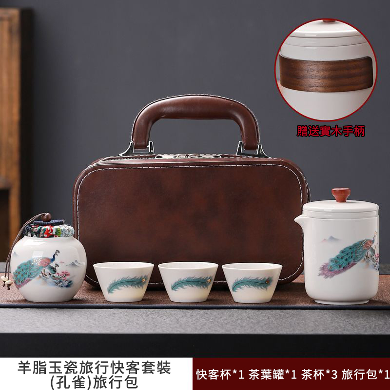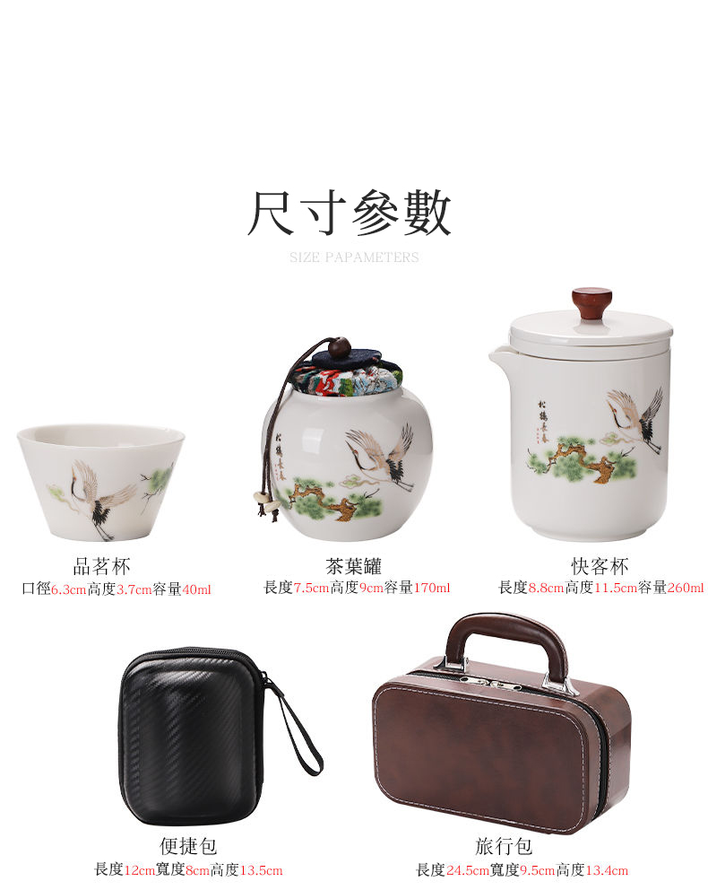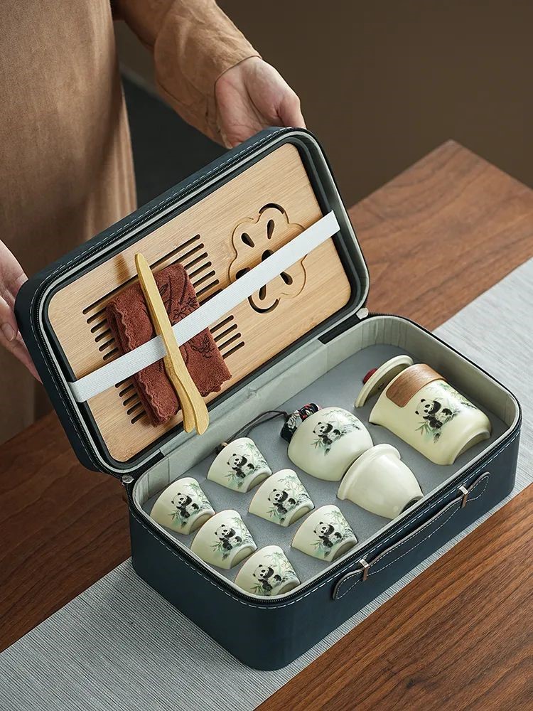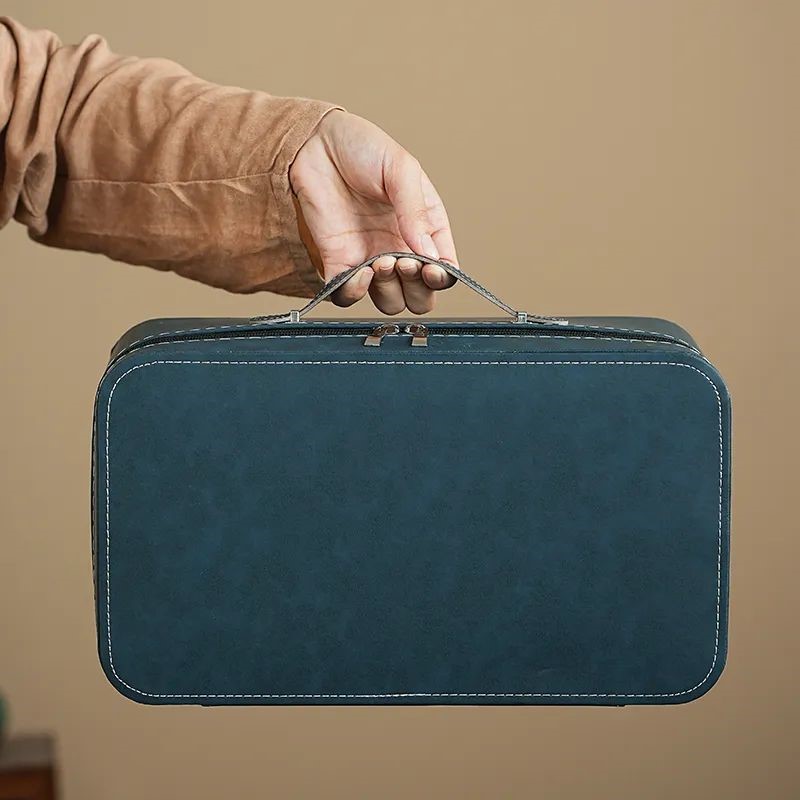這套質樸淡雅的茶具套裝採用皮包式旅行包進行收納,整體小巧精緻,手提方便。