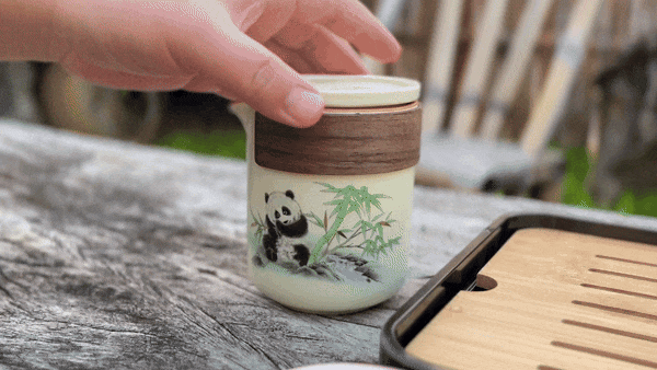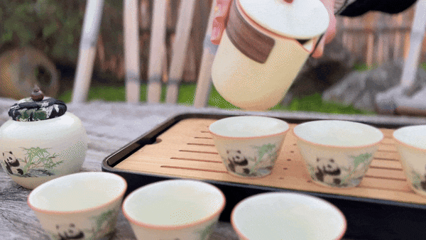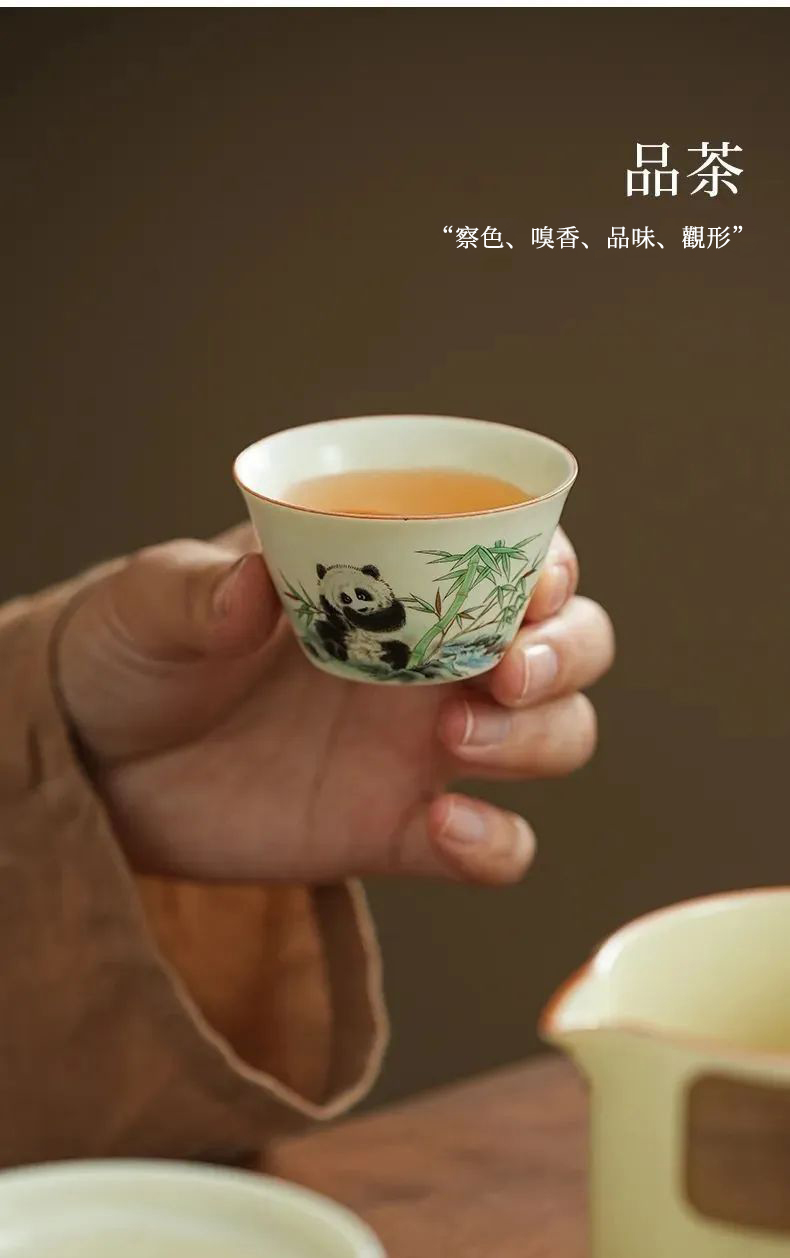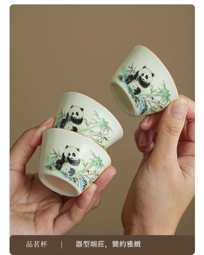 茶杯將國寶熊貓作為創意靈感,在竹林中嬉戲的畫面,與器物融合,巧妙融於茶器之中,萌係可愛,令人在品茗之際,也能體悟天地之和美。
