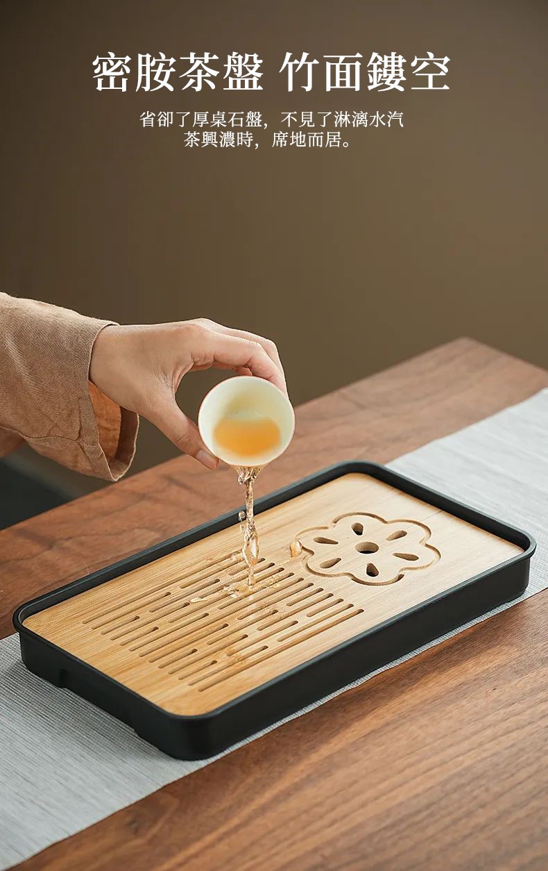 茶盤採用原竹材質,竹面鏤空設計,排水順暢,再也不見淋漓水汽,茶興濃時,即可席地而居。