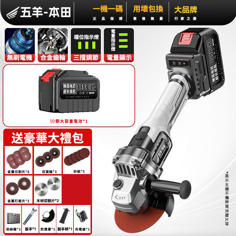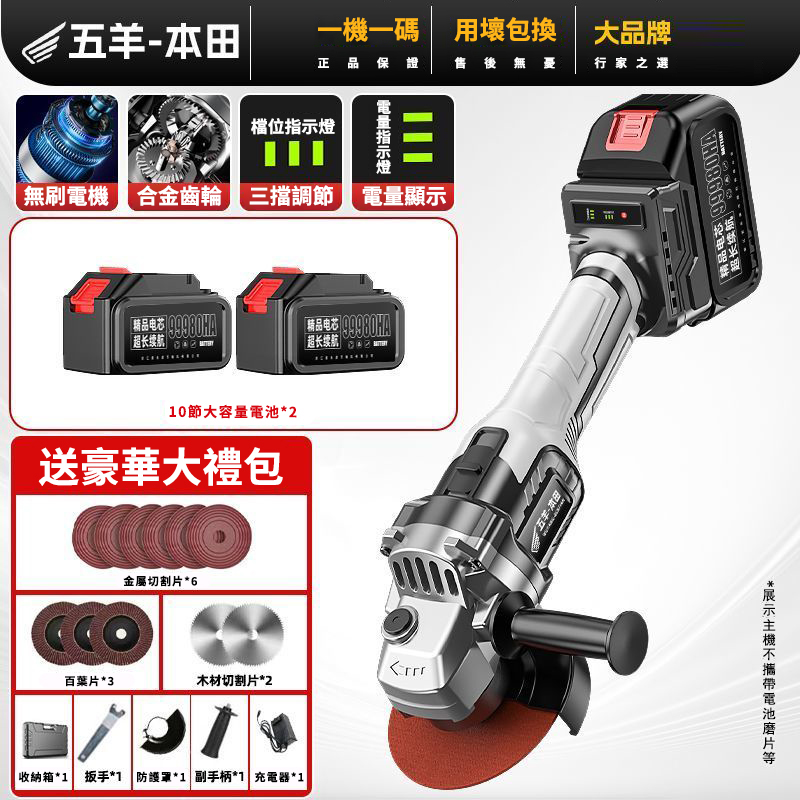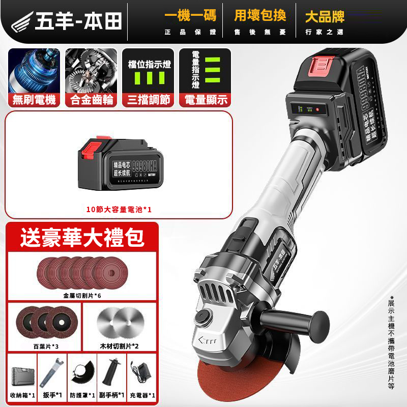 15分鐘前【日本-HONDA】升級帶電顯进口無刷鋰電角磨機 打磨 拋光 切割 一機多用 純銅電機 高效散熱 配置防護護罩 保護你的安全作業 保固三年 損壞包退換 限量出清 - 69800豪華電顯款【1電池】+紙盒款