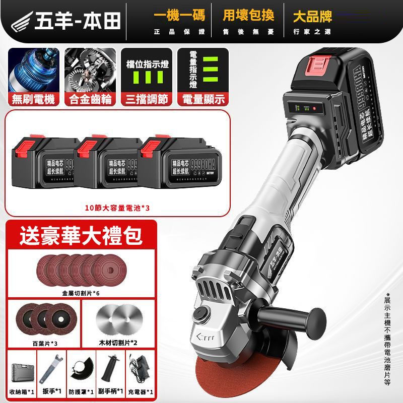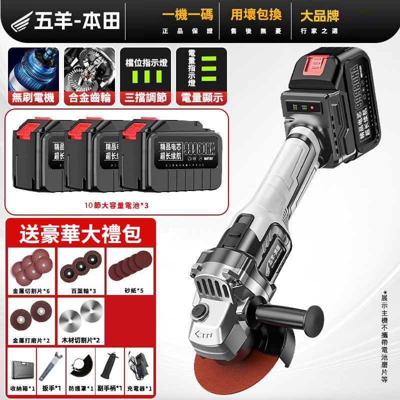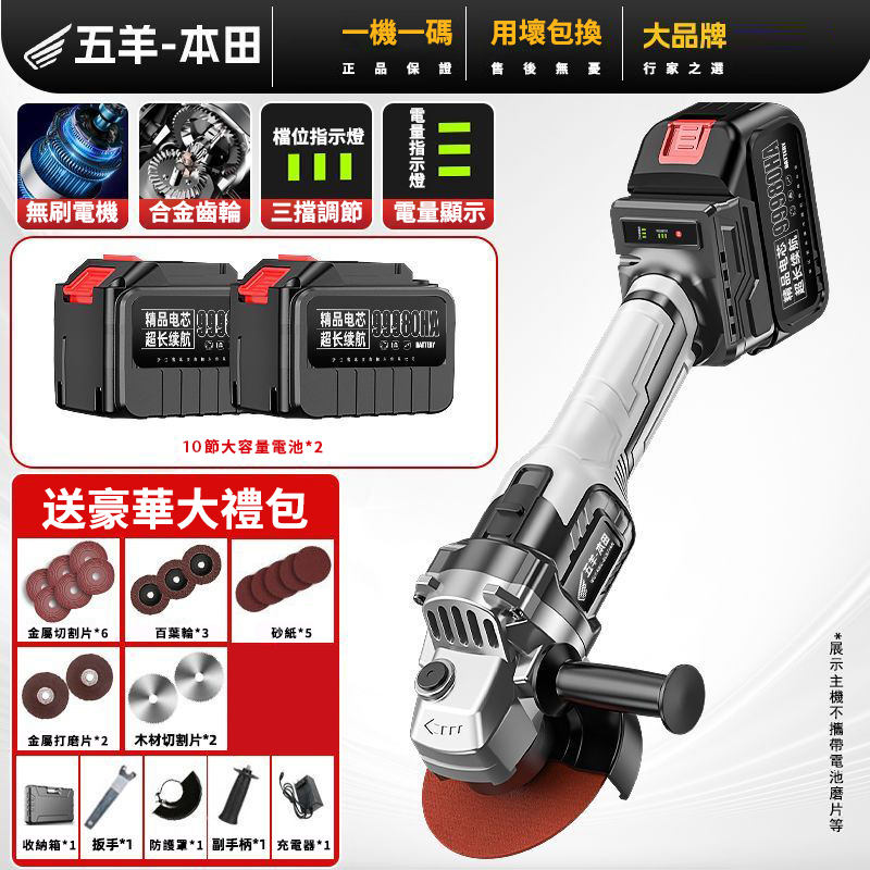 15分鐘前【日本-HONDA】升級帶電顯进口無刷鋰電角磨機 打磨 拋光 切割 一機多用 純銅電機 高效散熱 配置防護護罩 保護你的安全作業 保固三年 損壞包退換 限量出清 - 69800豪華電顯款【3電池】+塑盒