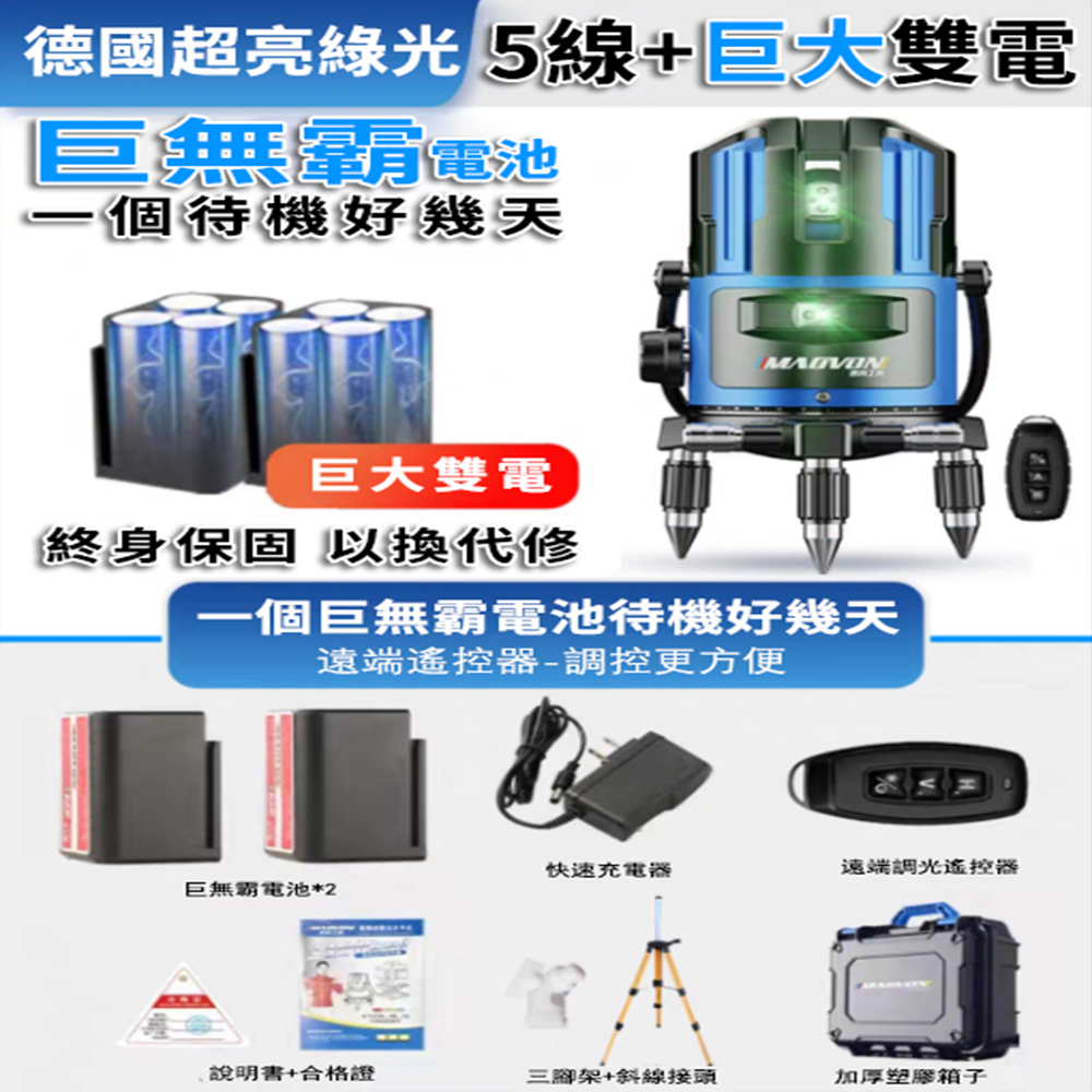 4分鐘前熱銷破萬件!戶外清晰可見【德國MAOVON】歐司朗綠光2/3/5線鐳射儀 - 【5線】巨大雙電+三腳架 +遙控 NT$3550